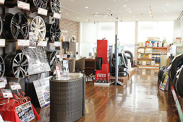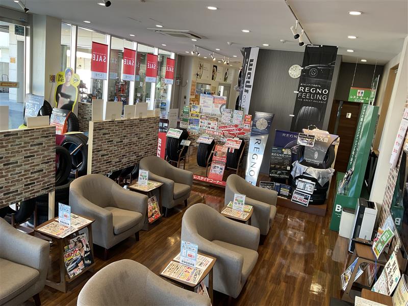 福井タイヤ商会 姫路営業所店内は木目を基調にした落ち着いたインテリアです。カフェスペースではゆったりくつろいでお過ごしいただけます。