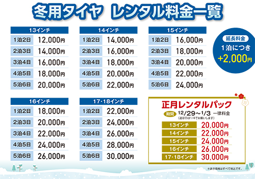 1泊2日からご利用できる、冬用タイヤのレンタルが可能です!